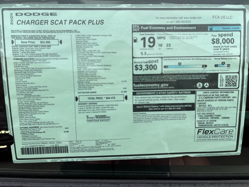 Blacktop Package: Dark Exterior Badging; Dual Rear Exhaust with Black Tips; 20 X 10 Dark Finish Aluminum Wheels. Quick Order Package 22B Scat Pack Plus: Wireless Google Android Auto; Black Color Multi-Function Mirrors; Surround View Camera System; Front Cubby Bin with Light; Bright Pedals; Illuminated Door Pull Handles; Map-In-cluster Display; Integrated Voice Command with Bluetooth; Power 2-Way Passenger Lumbar Adjust; Glove Box Lamp; Head Up Display; 2-Way Manual Adjust Front Head Restraints; Alexa Built-In; Power Adjust 8-Way Front Passenger Seat; Wireless Apple CarPlay; LED Map Pockets; Power Tilt/telescope Steering Column; Disassociated Touchscreen Display; 800 Amp Maintenance Free Battery; Low Back Bucket Seats; Attitude Adjustment Lighting; Wireless Charging Pad; Ventilated Front Seats; 2-Way Power Driver Lumbar Adjust; LED Footwell Lighting; Rain Sensitive Windshield Wipers; Integrated Center Stack Radio; Heated Front Seats; Connectivity - US/Canada; GPS Navigation; 4G LTE Wi-Fi Hot Spot; Traffic Sign Information; Windshield Wiper De-Icer; Premium LED Low-High Reflective Headlamps; Connected Travel and Traffic Services; Heated Second Row Seats; Heated Exterior Mirrors; Leatherette Seats; Power Windows Global Down W/key Fob; Performance Pages; Exterior Mirrors Logo Lamps; HD Radio; Uconnect 5 Navigation with 12.3 Display; Automatic High-Beam Headlamp Control; Exterior Mirrors with Memory; Power Adjust Mirrors; 16 Color Driver Display; 8-Way Power Driver Seat Adjust; Power Hatch; Radio. Driver Seat. Mirrors and Steering Column Memory. Destroyer Gray. Destroyer Gray. Demonic Red Seats. **Equipment listed is based on original vehicle build and subject to change. Please confirm the accuracy of the included equipment by calling the dealer prior to purchase.**