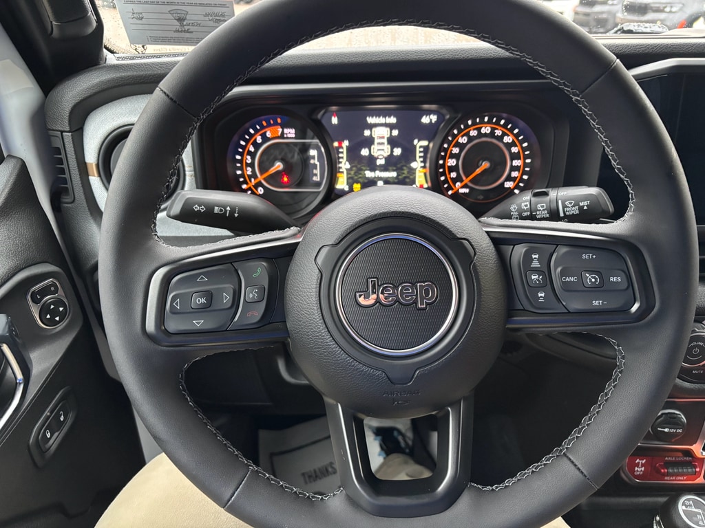 Convenience Group: Emergency/Assistance Call; 2-Door Passive Entry. Front Door Locks; Remote Start System; Cluster 7.0 TFT Color Display; Universal Garage Door Opener; Heated Front Seats; Air Conditioning W/Auto Temp Control; Heated Steering Wheel; Air Filtering. Quick Order Package 22W Willys: 7 & 4 Pin Wiring Harness; Conventional Differential Front Axle; 4-Wheel Drive Swing Gate Decal; Black Grille; MOPAR All-Weather Floor Mats; Injection Molded Black Rear Bumper; Dana M210 Wide HD Tube Front Axle; Daytime Running Lamps LED Accents; Front LED Fog Lamps; LED Premium Reflector Headlamps; E-Locker Rear Axle; Corning Gorilla Glass; Security Alarm; 4.10 Rear Axle Ratio; 5. 675 lbs GVWR; Class II Receiver Hitch; Mold In Color Bumper W/Gloss Black; Advanced Brake Assist; Willy's Suspension; LT285/70R17C BSW Mud Terrain Tires; Automatic Headlamps; Deep Tint Sunscreen Windows; Off-Road Plus Mode; 17 X 7.5 Painted Black Wheels; Willys Hood Decal; Full Speed Forward Collision Warning Plus; Rock Protection Sill Rails; Power Heated Mirrors; Enhanced Adaptive Cruise Control; Auxiliary Switches; Dana M220 Wide Rear Axle; Molded in Color Rubicon Highline Flare; Premium Wrapped Steering Wheel; Sun Visors W/Illuminated Vanity Mirrors. Sky 1-Touch Power Top. **Equipment listed is based on original vehicle build and subject to change. Please confirm the accuracy of the included equipment by calling the dealer prior to purchase.**